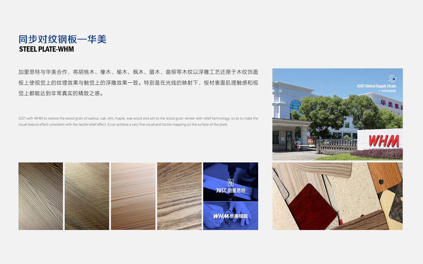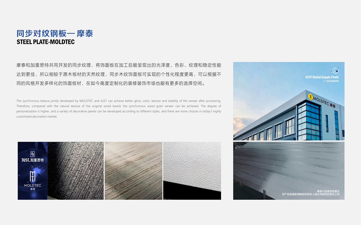 United with the world's top steel plate enterprises, and combined with JUST's intelligent synchronous grain alignment process, the grain of the plate will be finer and more three-dimensional, and the wood grains of walnut, oak, elm, maple, wax and willow will be restored to the wood grain veneer by relief process, so that the texture, touch and vision of the plate surface can achieve a very real delicate feeling. Compared with the natural texture of log board, synchronous wood grain veneer can achieve a higher degree of personalization, and diversified veneer boards can be developed according to different styles, and there are more choices in today's highly customized decoration market.